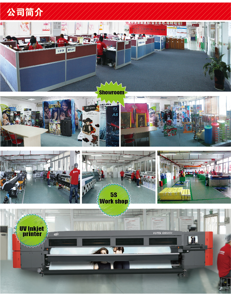 設(shè)備情況:有進口的日本羅蘭高精度寫真噴繪機36臺;戶外高速噴繪機日本精工機12臺;EPSON原裝墨高精度噴繪機8臺;美國威特UV機3臺;OCE平板噴繪機2臺;羅蘭熱轉(zhuǎn)印數(shù)碼噴繪機5臺;自動化后加工系列設(shè)備12臺。